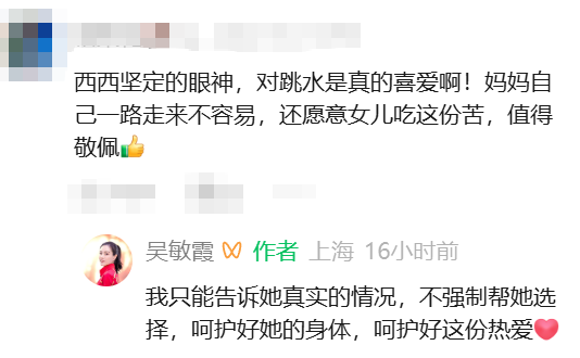 在最新视频的评论区,吴敏霞回复网友称,不强制帮女儿选择,呵护好她的身体和这份热爱。