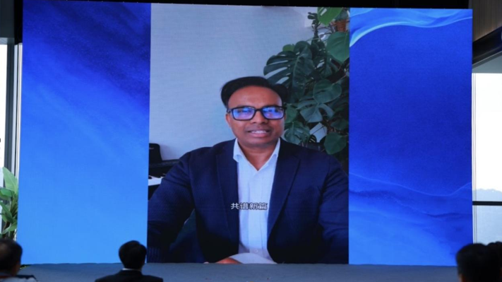 桑托仕通过视频形式发表致辞,他首先代表法国巴黎美院--美修艺术学院,对丝路友好使者驿站·三亚正式挂牌表示热烈祝贺,并正式授权三亚丝路友好使者驿站为学院在海南省的唯一合作伙伴。他表示,中法两国文化底蕴深厚、民间交流根基牢固,驿站的成立为两国民间文化交流、文明互鉴搭建了全新优质平台,期待后续依托驿站开展多元化文化艺术交流活动,携手续写中法友好交流新篇章,共同传承丝路精神,深化跨国人文往来。