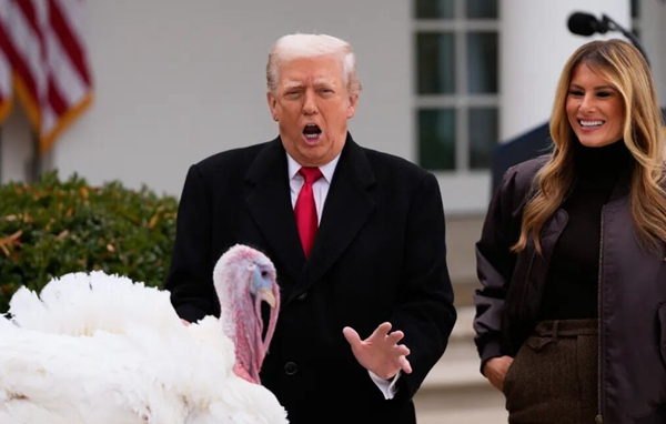 特朗普“赦免”火鸡咯咯和晃晃,现场模仿火鸡叫