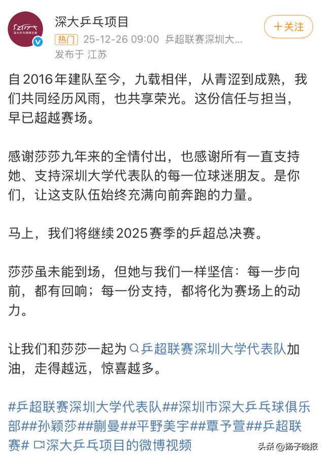 12月26日,深圳大学乒乓球俱乐部官方发布公告,宣布队内核心运动员孙颖莎因伤未愈,将不参与于当日在南京开赛的乒超联赛总决赛。