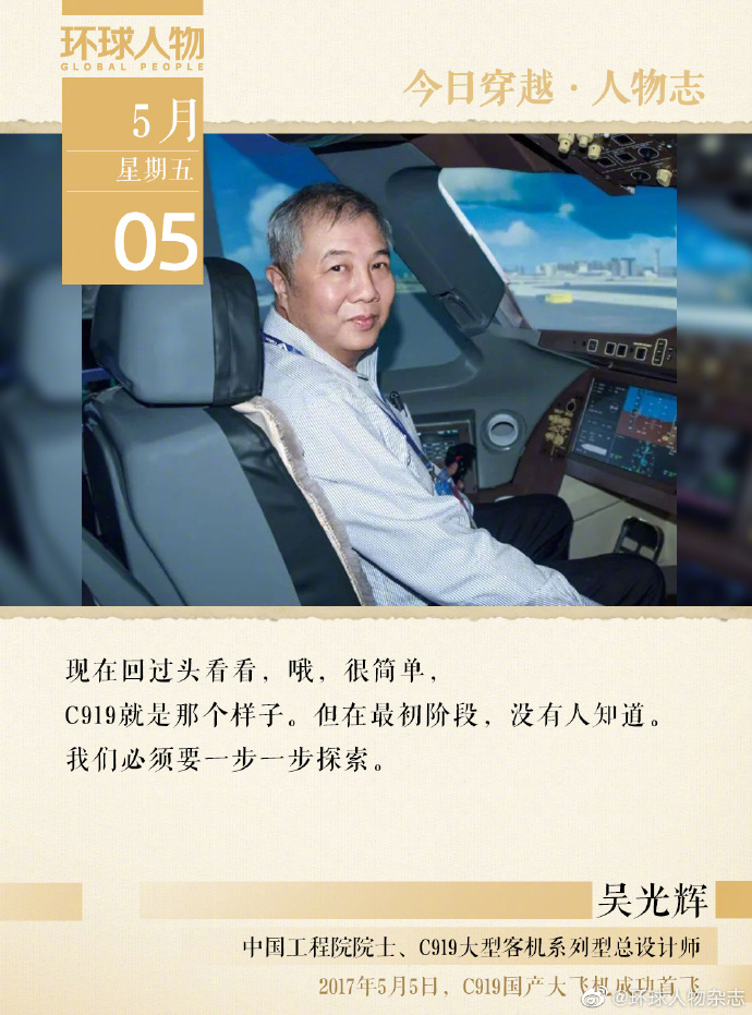 2017年5月5日,C919国产大飞机成功首飞,举国欢庆,C919总设计师吴光辉红了眼眶……吴光辉在此之前担任过多个飞机型号的总设计师,而C919是让他感到压力最大的飞机设计任务。他带领研制团队与时间赛跑,带头实行“611”和“724”的工作模式:“611”是指1个星期工作6天,每天工作11个小时;“724”是指在攻关关键期,1周工作7天,每天24小时,工作人员轮流倒班。从2008年被任命到2017年C919首飞,吴光辉的一头黑发几乎全白了。而他只是说,未来的道路上,还有很多难关需要征服,希望让更多的国产飞机安全飞上蓝天。