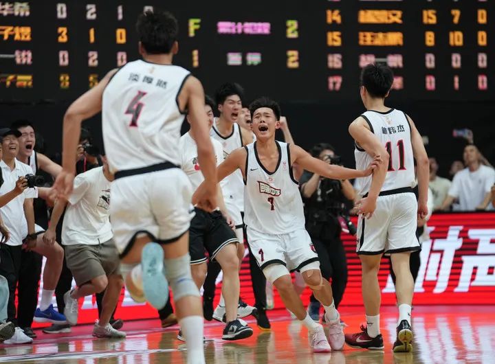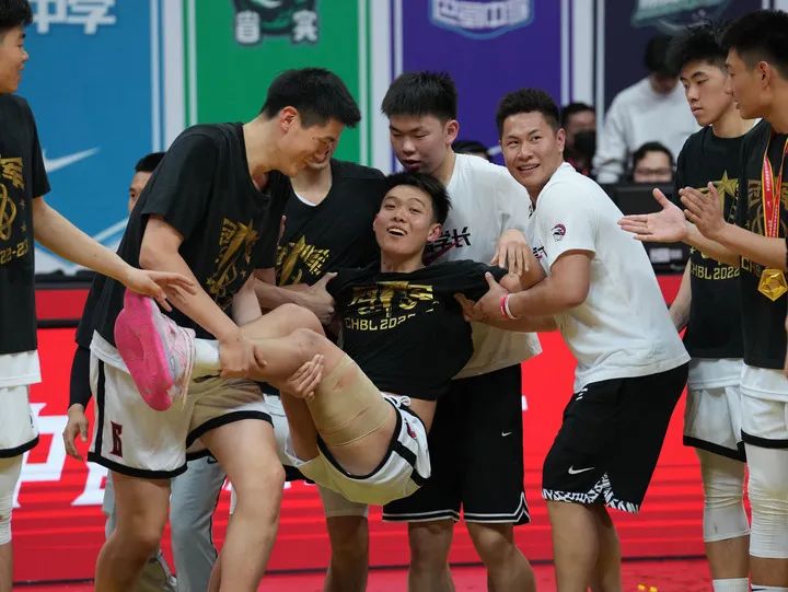 5月14日,回浦中学队球员张浩博(右二)在比赛结束后庆祝夺冠。新华社记者 孟永民 摄