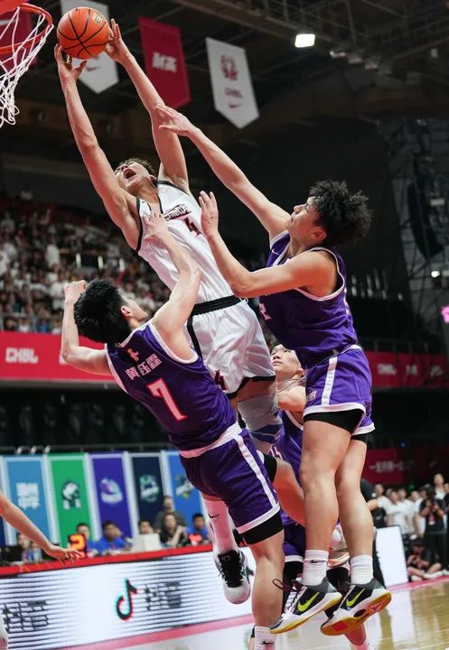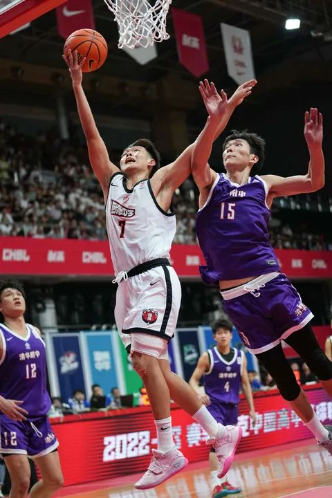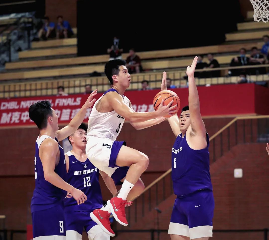 5月14日,回浦中学队球员淡厚然(左二)在比赛中完成关键补篮。新华社记者 孟永民 摄