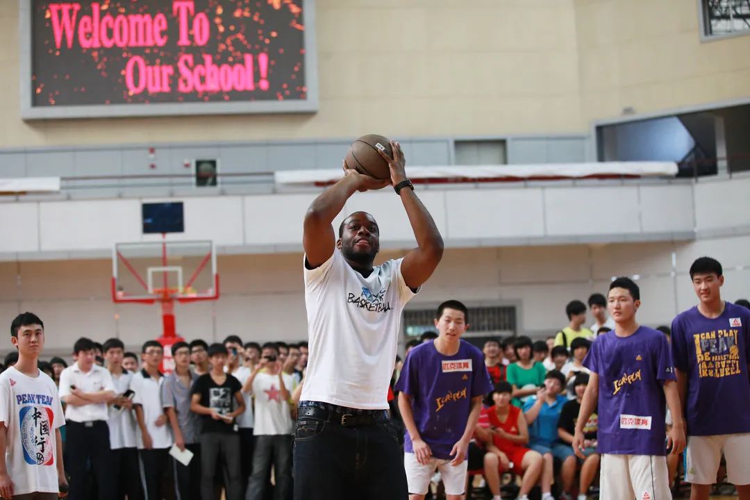 2011年,NBA球星卡尔·兰德里在临海市回浦中学传授篮球技艺。新华社发(孙金标 摄)