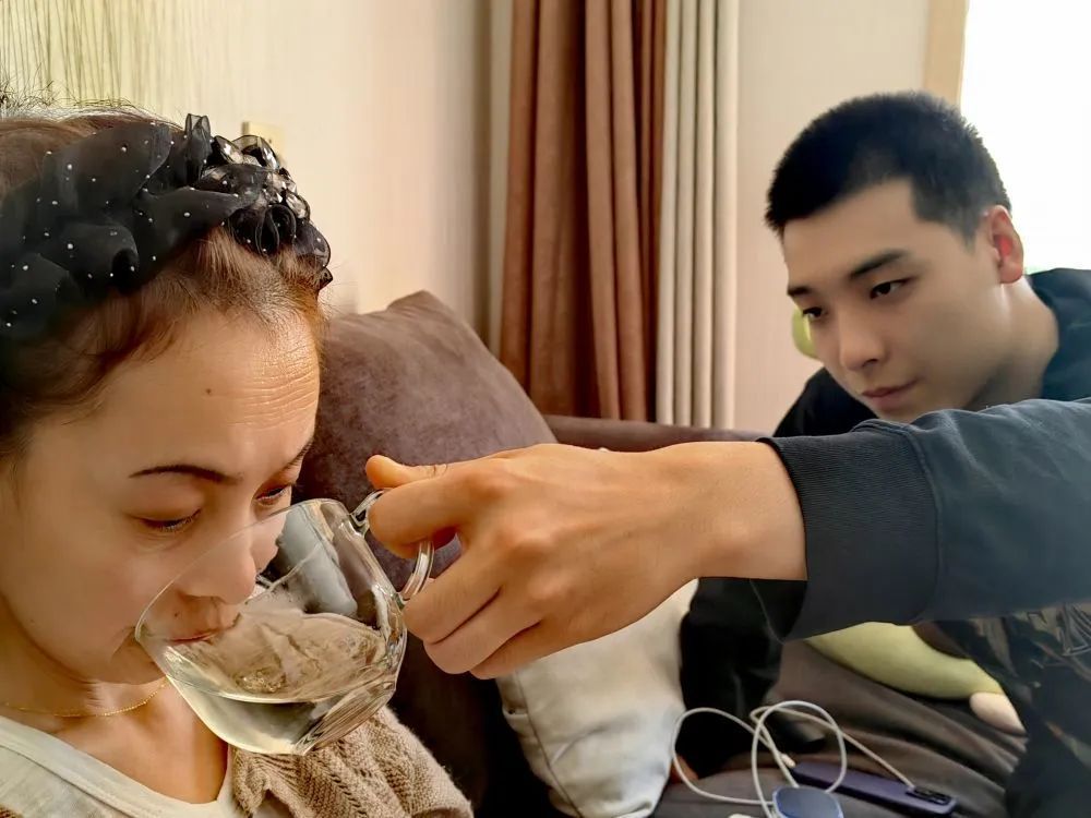 杨志洋帮助妈妈喝水。新华社记者 孙正好 摄