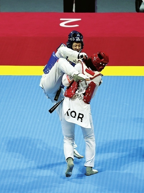 “加油!”“中国!”的喊声,成为跆拳道赛场最火热的一幕,从预赛、1/8、1/4到半决赛,现场观众的嗓子几乎喊哑。7时40分,决赛开始,韩国队实力强大,阵容包括了东京奥运会银牌得主李多滨等名将。中国队4名运动员身穿蓝色护具上场,比赛刚一开始双方就打得很激烈。第一回合,中国队21:30韩国队,落后9分。