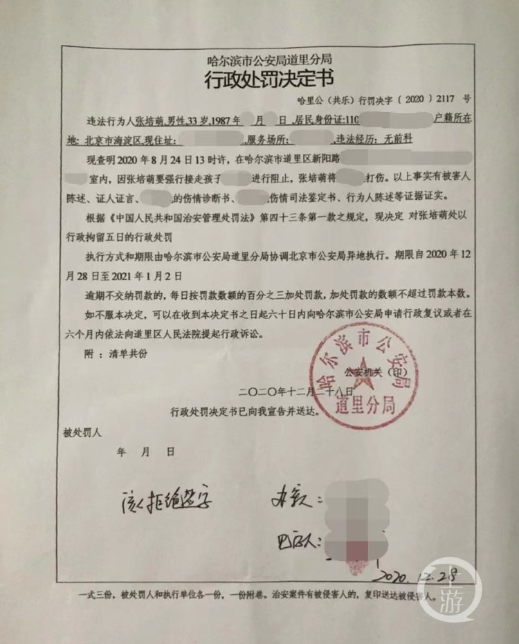 2020年12月28日,哈尔滨市警方对张培萌作出行政处罚决定。 受访者供图