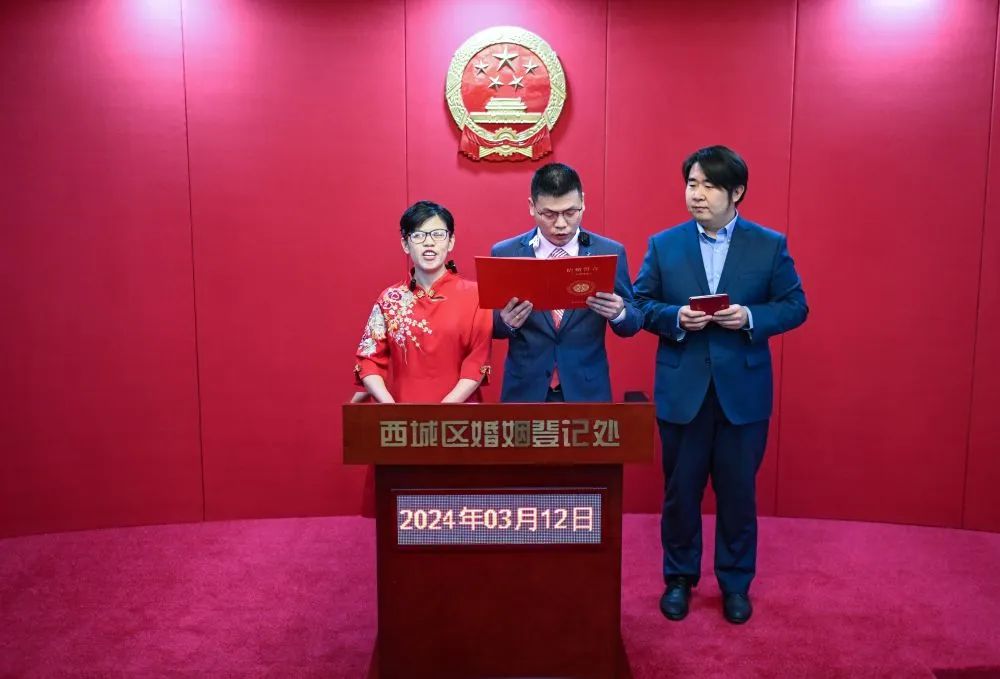 3月12日,王先生与张女士携手走上宣誓台准备进行结婚宣誓。(图片来源:新华社)