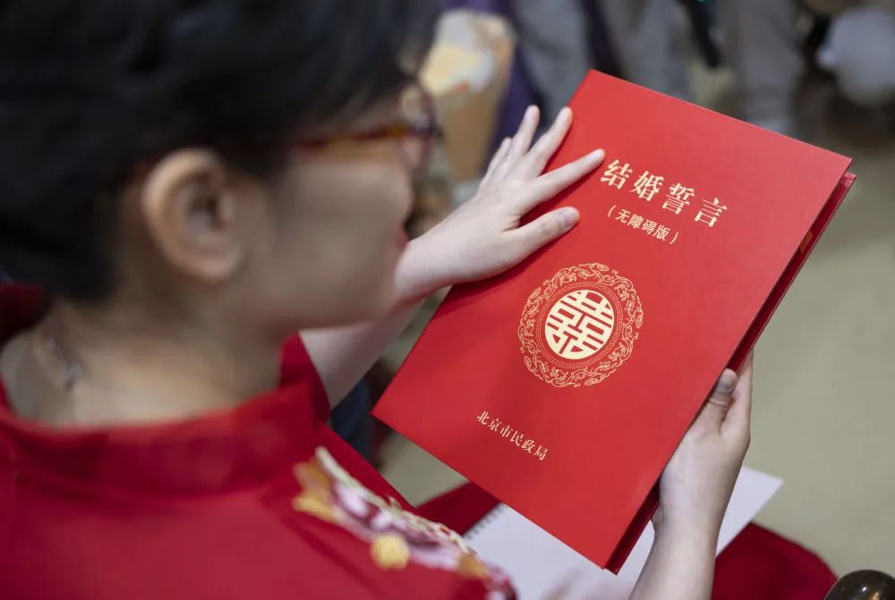 3月12日,新人张女士手捧无障碍版结婚誓言准备进行结婚宣誓。(图片来源:新华社)