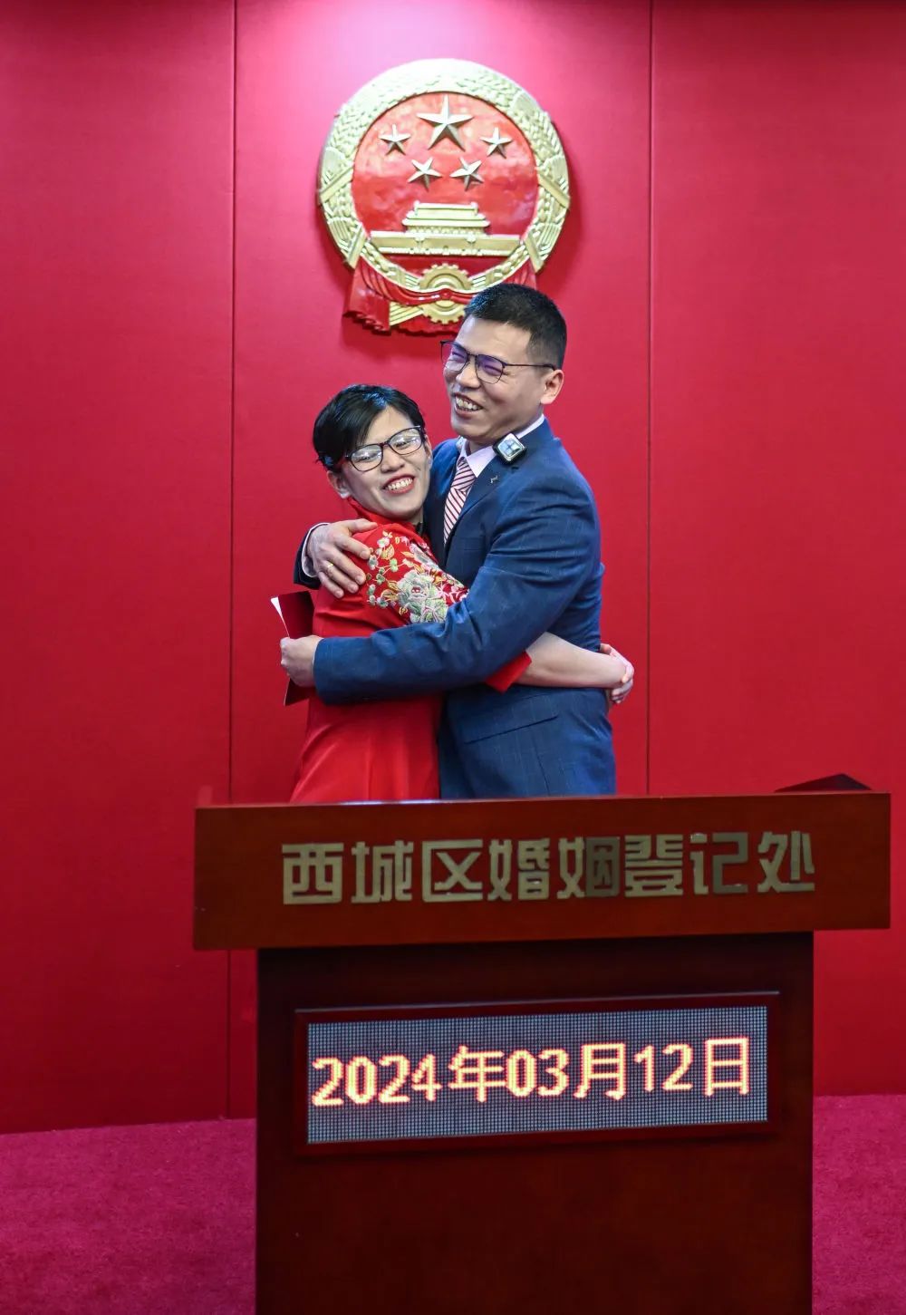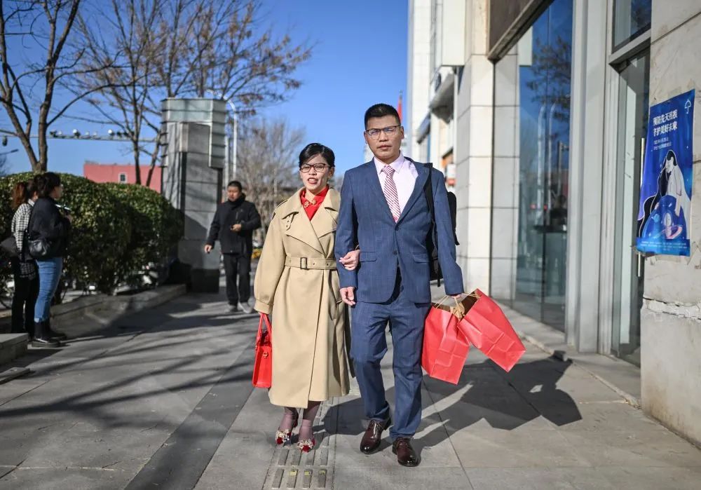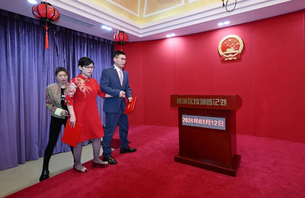 3月12日,新人张女士和王先生准备前往北京市西城区民政局婚姻登记服务中心进行结婚登记。(图片来源:新华社)