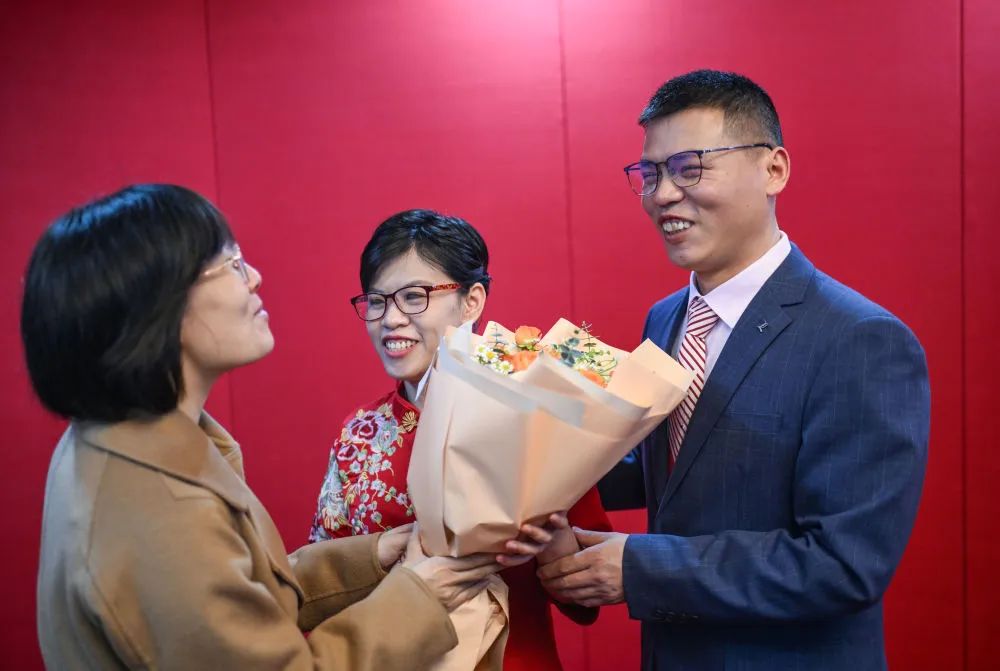 3月12日,中国残联直属机关工会、妇工委工作人员为张女士和王先生献上鲜花。(图片来源:新华社)