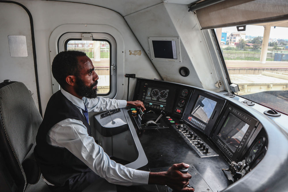 5月10日,埃塞俄比亚火车司机在亚吉铁路列车的驾驶室里工作。新华社记者刘方强摄