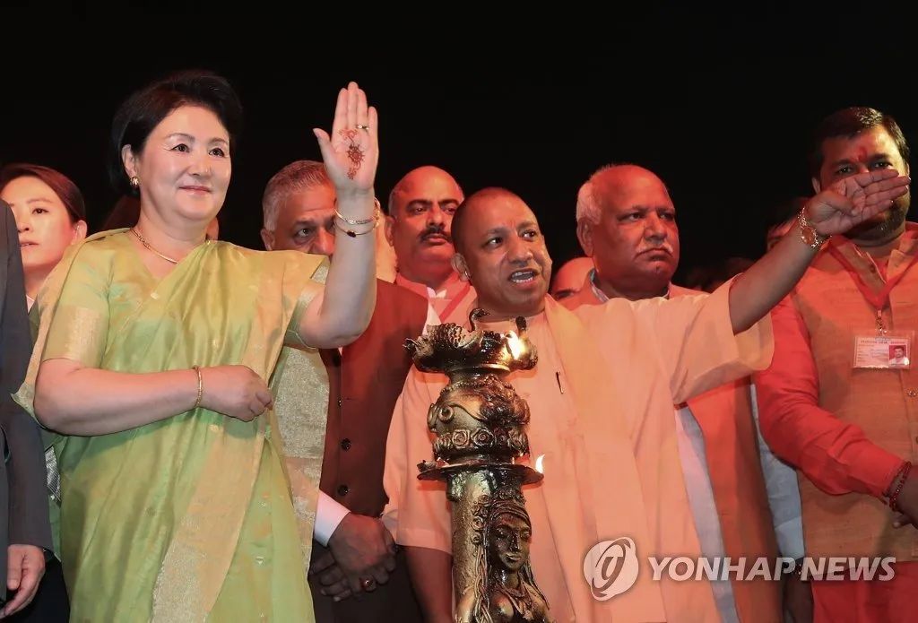 身着一袭翠绿色的印度纱丽,手心画有印度特色的曼海蒂手绘,2018年11月,时任韩国总统文在寅的夫人金正淑访问印度时,以这身装扮现身排灯节传统祈福活动,并出席了许王后纪念公园开工仪式。
