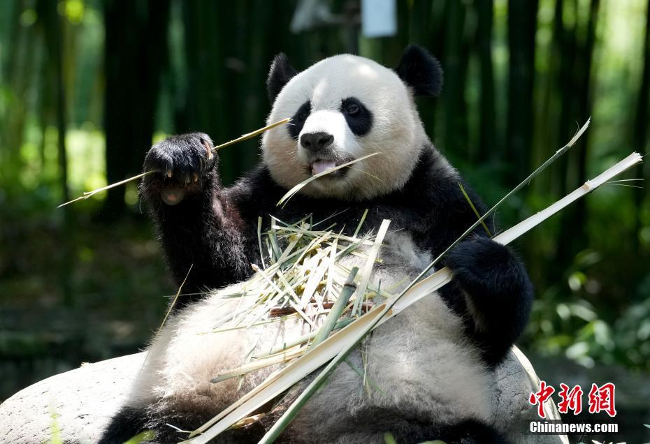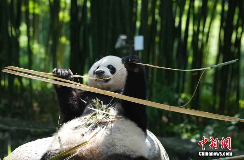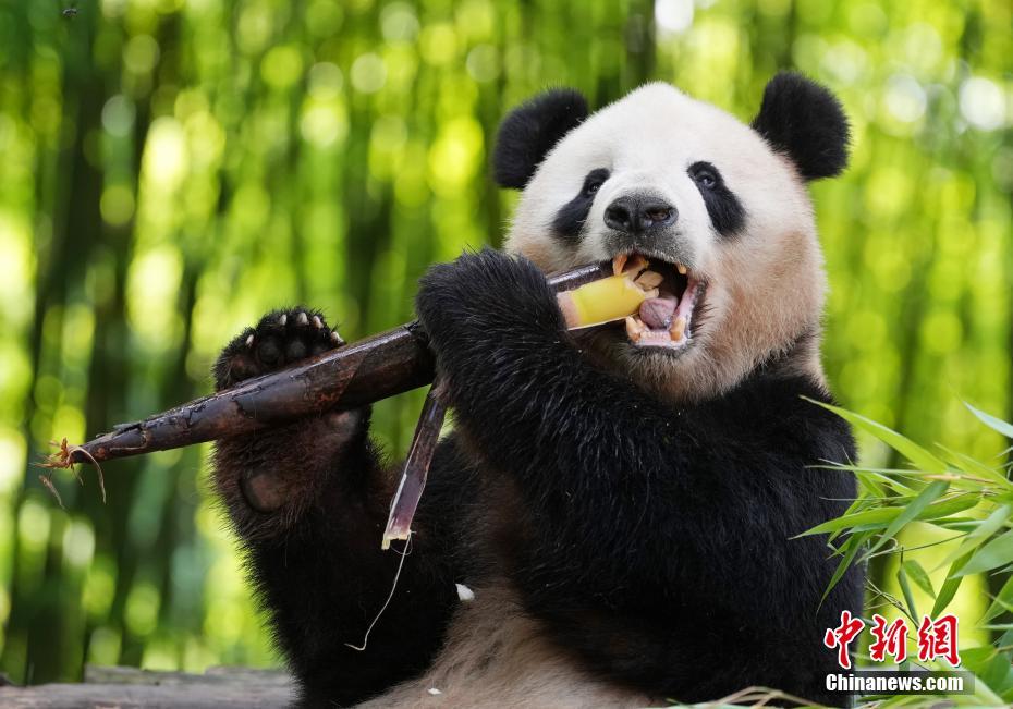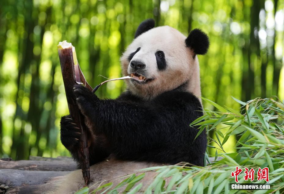 图为大熊猫“美香”在享用美食。中新社记者安源摄 安源 摄