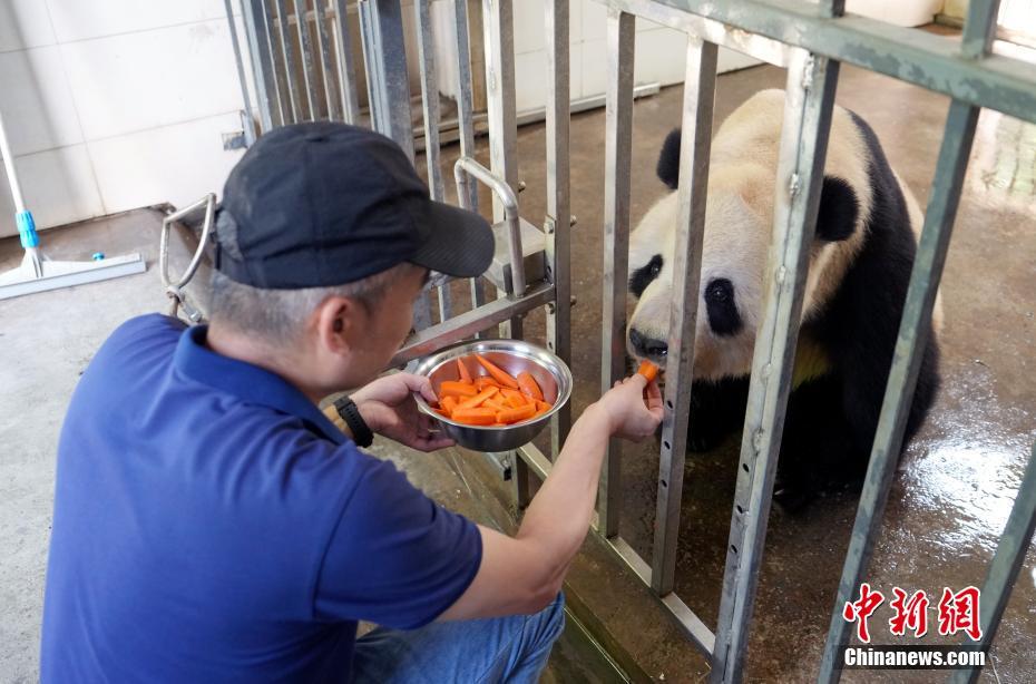 图为中国大熊猫保护研究中心饲养师唐勇在给大熊猫“添添”喂胡萝卜。中新社记者安源摄 安