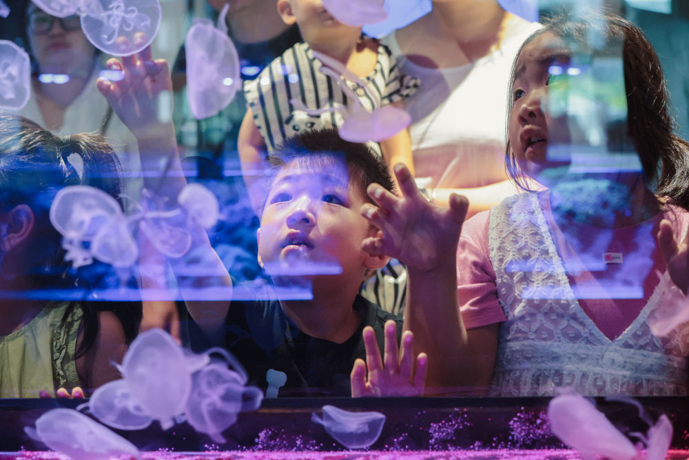 8月18日,“小候鸟”在宁波海洋研究院实践创新基地观看水母。