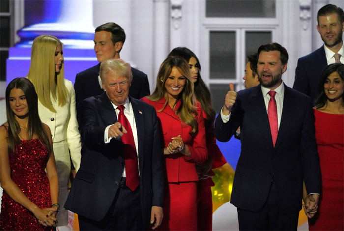 7月18日,美国前总统特朗普(前排左二)和共和党副总统候选人万斯(前排右二)在共和党全国代表大会上向观众致意。新华社记者 吴晓凌 摄