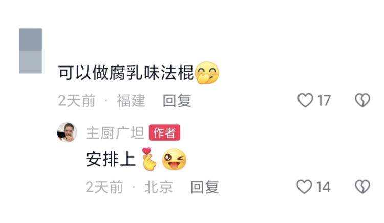 戴广坦告诉记者,自己很喜欢看粉丝反馈的“小作业”,有时在粉丝的一张照片里看到一大桌中餐里面有一盘自己发布过教程的法餐,还是很有感触的。