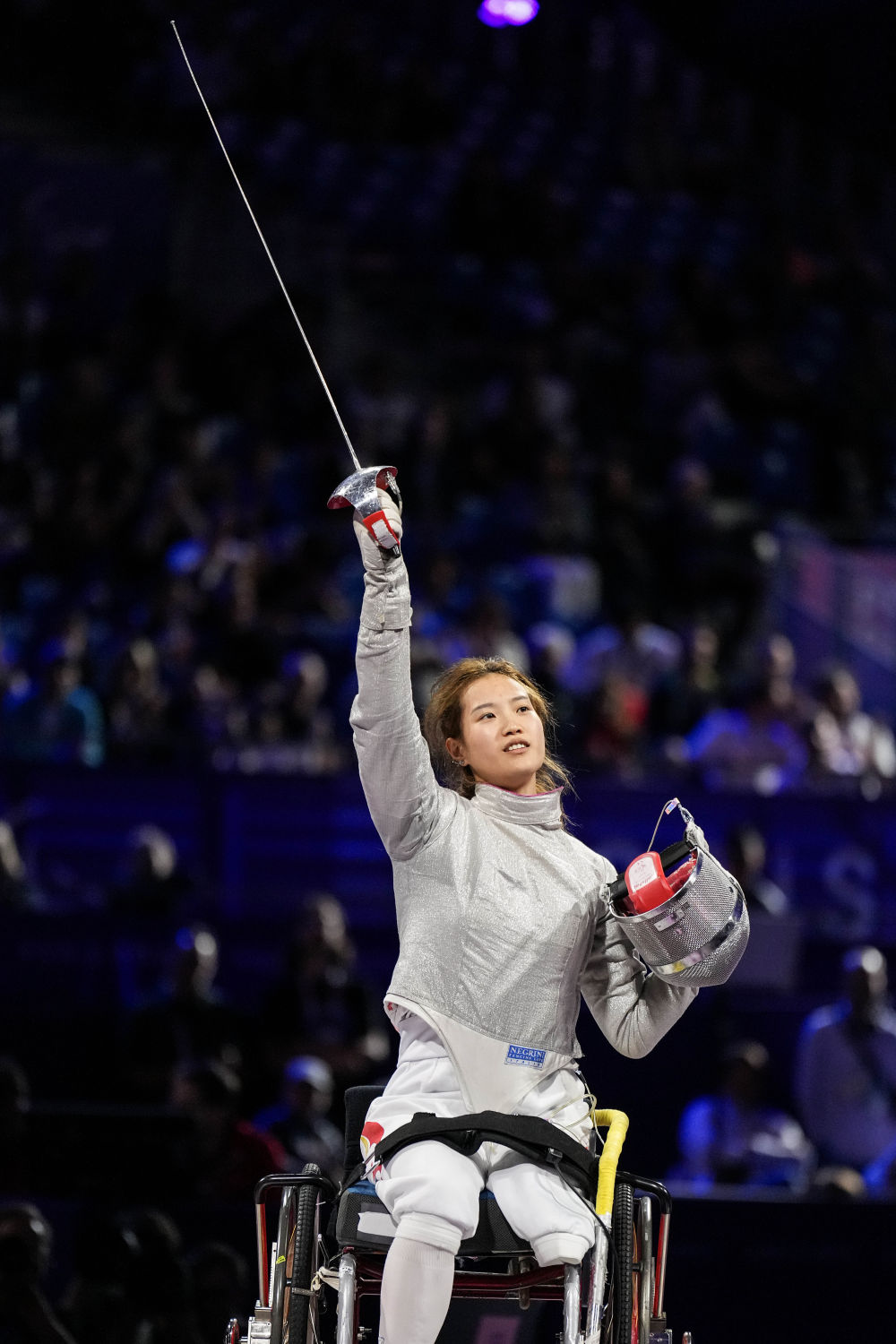 9月3日,辜海燕在获胜后庆祝。当日,在巴黎残奥会女子佩剑个人A级决赛中,辜海燕15:10战胜波兰选手德罗日季,获得冠军。新华社记者 张豪夫 摄