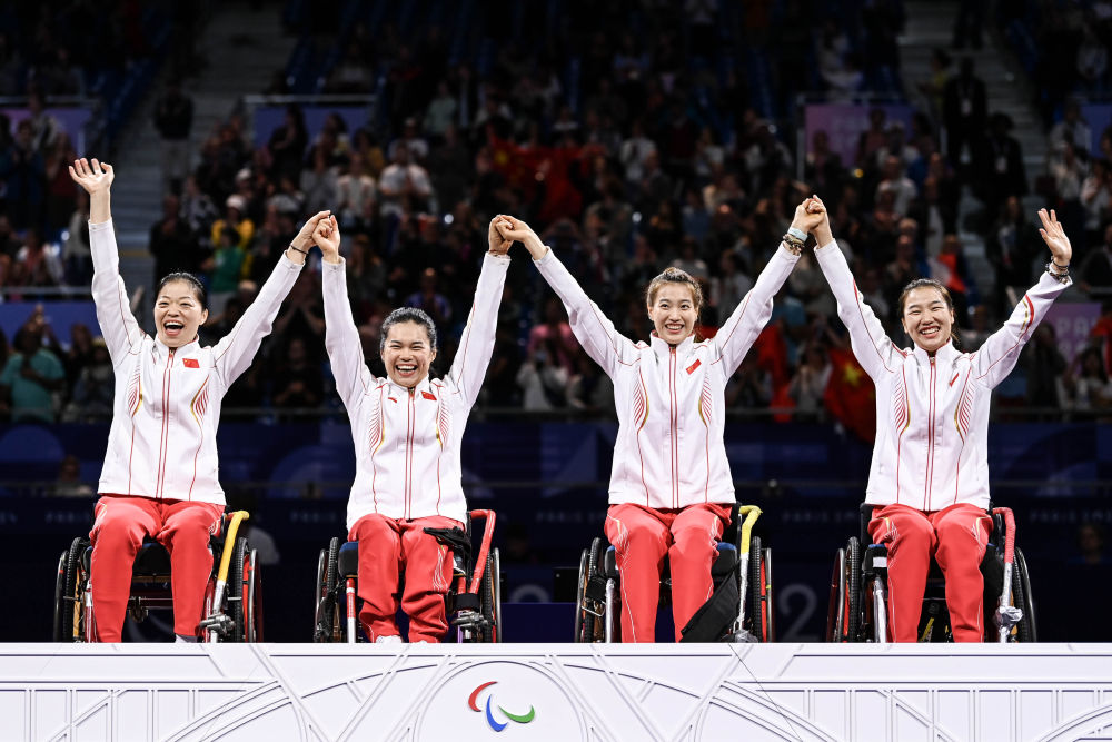 9月7日,冠军中国队选手邹绪凤、康苏、辜海燕、陈远东(由左至右)在颁奖仪式上庆祝。当日,在巴黎残奥会女子重剑团体赛决赛中,中国队45:37战胜乌克兰队,获得冠军。新华社记者 张豪夫 摄