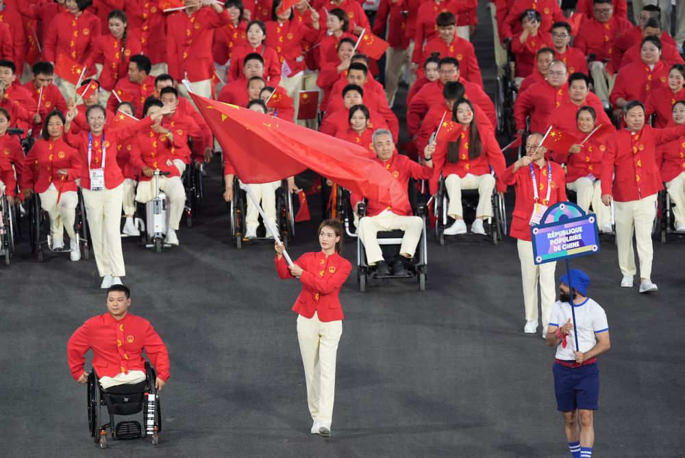 8月28日,中国体育代表团旗手女子轮椅击剑运动员辜海燕(前中)和男子举重运动员齐勇凯(前左)在开幕式上入场。当日,第17届夏季残疾人奥林匹克运动会开幕式在法国巴黎举行。新华社记者 才扬 摄