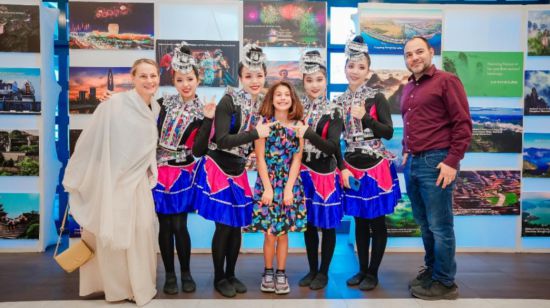观众与身穿民族服饰的演员在活动现场合影。