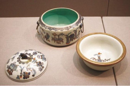 古时没有微波炉,做好的食物如何在冬季保温呢?在南京市博物馆(朝天宫)就有一套清朝光绪年间的“保温饭盒”——描金青花五彩八宝纹瓷温碗。它由三个部件组成:“外壳”形似一口锅,两侧各有一只金属环作为把手;“锅盖”上雕塑着一只栩栩如生的狮子狗;“内胆”是一只瓷碗,碗中绘的是莲花纹。碗口外扩,直径大约有20多厘米,正好扣在外壳的边缘。青花温碗的内部结构与今天的保温瓶相似,外壳与内胆分隔开,形成中空的结构。但相对于现代工艺制作的保温瓶,瓷器无法形成真空,又容易导热。因此,使用这件“保温饭盒”,要在“锅”里倒上开水,把盛着饭菜、汤羹的瓷碗放进去,浸泡在开水中,以源源不断地吸收热量。