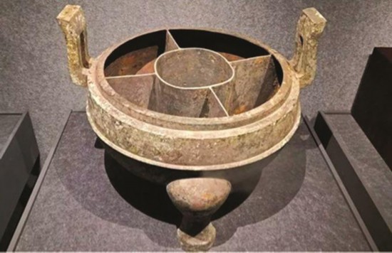 冬季,热腾腾的火锅无疑是人们的首选美食。在南京博物院,就展出有江苏盱眙西汉江都王刘非墓中出土的一件铜分格鼎。该鼎顶面饰三凤鸟形立钮,鼎身饰长方形附耳,腹中部饰一周凸棱,圜底,三蹄足,内部有四块隔板与一件圆筒,将整个鼎内分为五块独立区域,可以将不同食材放在不同的格内,避免串味。这件铜分格鼎还曾在央视《中国国宝大会》节目中亮相,被大家称为“2000多年前的鸳鸯锅”。