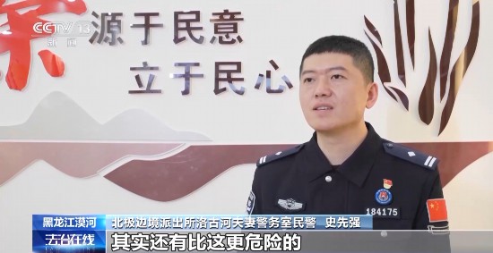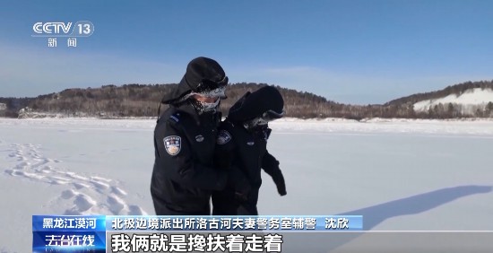 北极边境派出所洛古河夫妻警务室民警 史先强:界江巡逻肯定不轻松,就像今天,我们两口子就摔了好几跤。其实还有比这更危险的,有一次我们组织护边员去巡逻,有一名护边员不小心踩断了冰层,大半个身子掉进了江里,我们及时把他拉了出来。他当时就像穿了一层冰铠甲一样,我们现在想想还心有余悸。