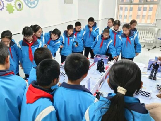 在甘肃省渭源县清源中学分校创客教室内,学生们正在观摩机器人竞赛。受访者供图