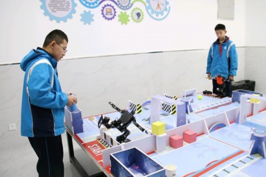 在甘肃省渭源县清源中学分校的创客教室里,一场“穿越四维时空门”的机器人模拟赛正在紧张进行。两台机器人在赛场上灵活穿梭,它们的操控者——初一年级的杨朔和刘一帆,正全神贯注地盯着屏幕,每一个细微的动作都透露出他们与机器人的“人机合一”。