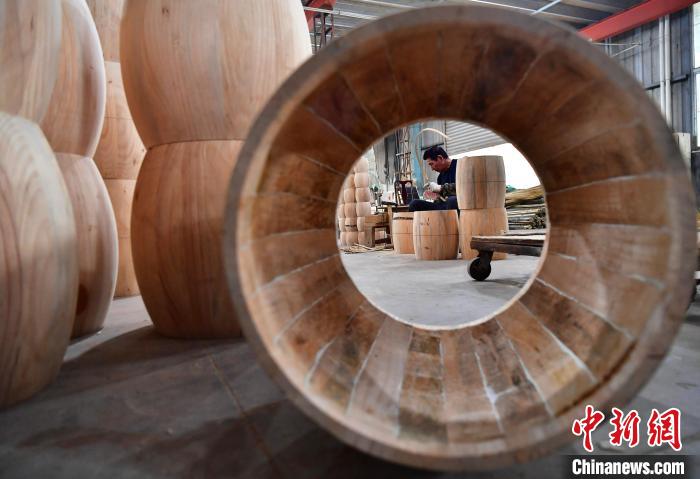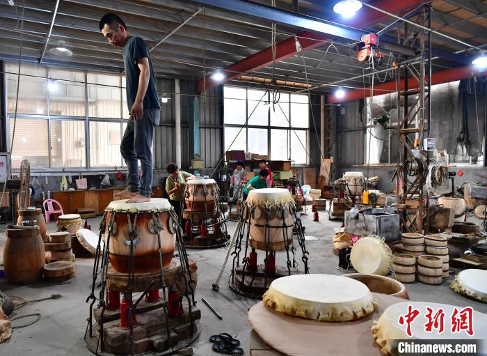 图为车间内摆满大小各异的鼓身,制鼓师傅正忙着制鼓。中新网记者张斌 摄