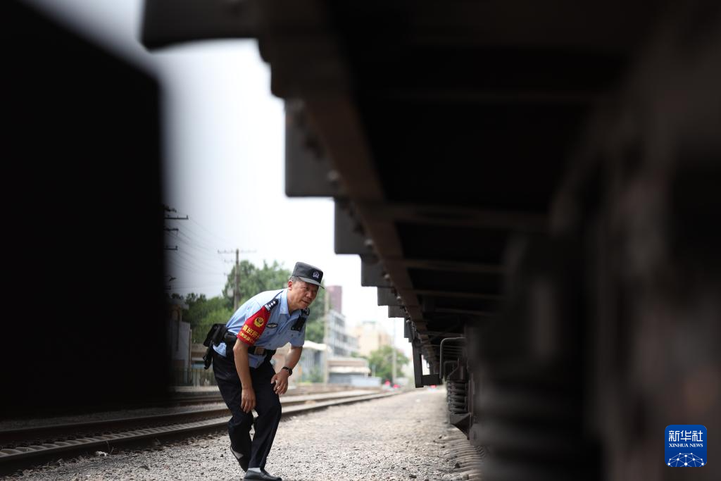王仁福在长征车站货场检查货车(6月17日摄)。