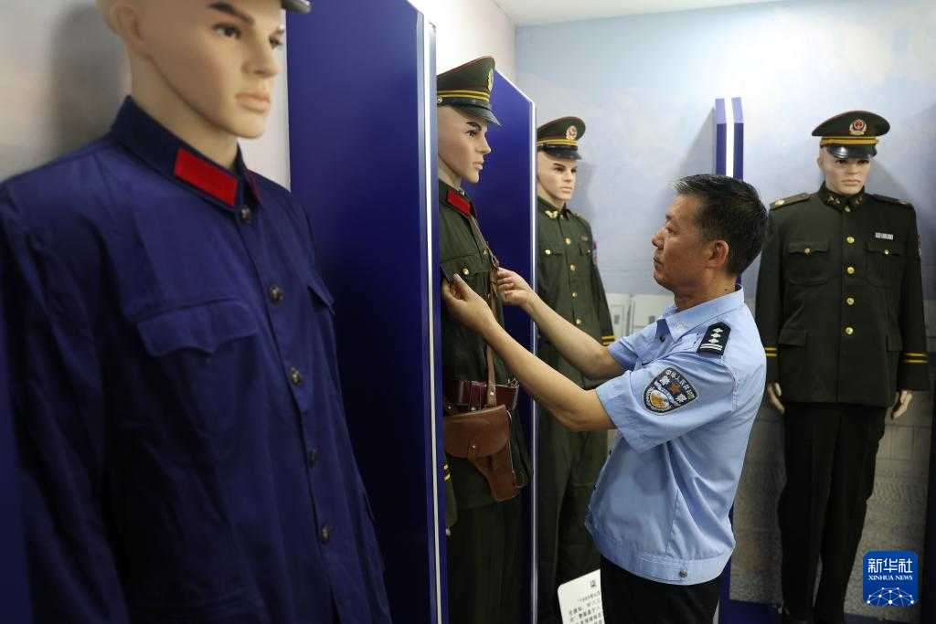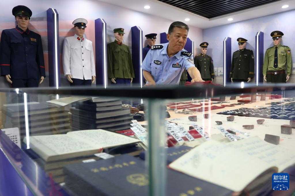王仁福在长征警务区的铁警警史馆里整理自己收藏的老警服(6月17日摄)。新华社记者 陈斌 摄
