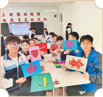 二连浩特第一中学的蒙古国学生体验中国剪纸并展示作品。 敖 民摄
