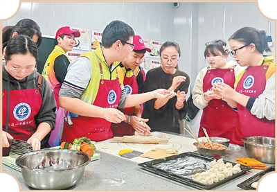 二连浩特第一中学的中蒙两国师生在包饺子。 乌图布信摄