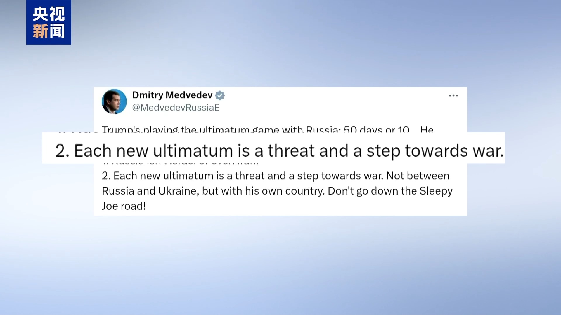 对此,俄罗斯联邦安全会议副主席梅德韦杰夫在社交平台发文回应:特朗普正在与俄罗斯玩所谓“最后通牒”的游戏,但我希望他记住,每一则“最后通牒”都构成威胁,将让美俄关系恶化,甚至走向战争。此后,梅德韦杰夫再次强调,美方无人有资格决定俄罗斯何时“坐上谈判桌”。