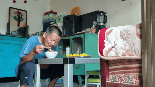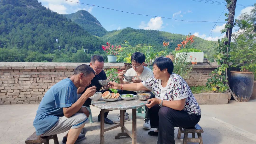 海松在村民家吃饭。(7月26日摄)