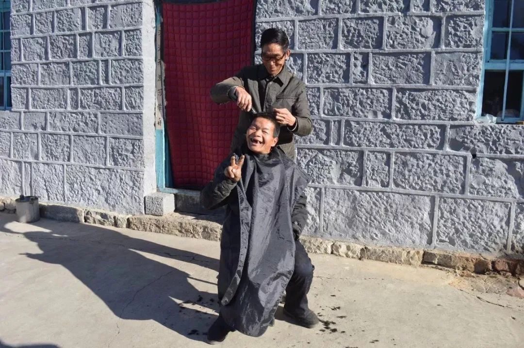 村民桑建国为海松理发。(资料照片)