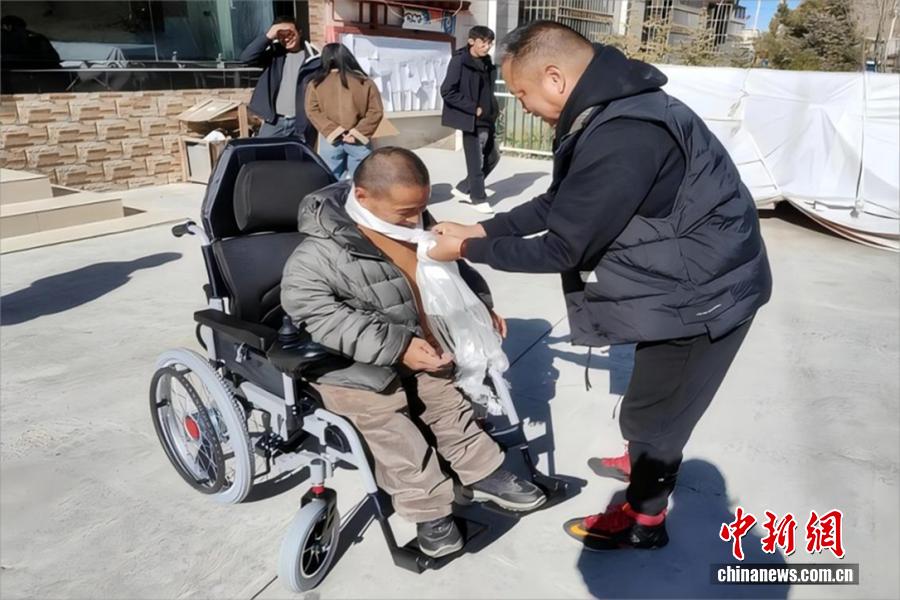 扎西平措为巴热村残障人士发放辅助设备。 受访者供图