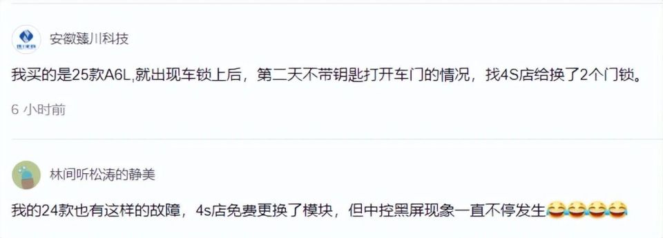一位网友直言:“我的2020款A6L也有车锁故障,这可能不是批次问题,而是设计缺陷。”这条留言迅速获得数百点赞,不少车主表示有同感。