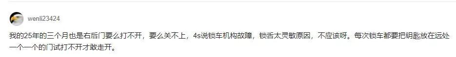 还有的网友表示:“我的2025年的三个月也是右后门要么打不开,要么关不上,4S店说锁车机构故障,锁舌太灵敏原因,不应该呀,每次锁车都要把钥匙放在远处一个一个的门试,打不开才敢走开。”