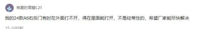 值得注意的是,除A6L外,部分奥迪A4L车主也反映存在类似问题,让人不得不怀疑这是不是奥迪某代门锁系统的共性缺陷。