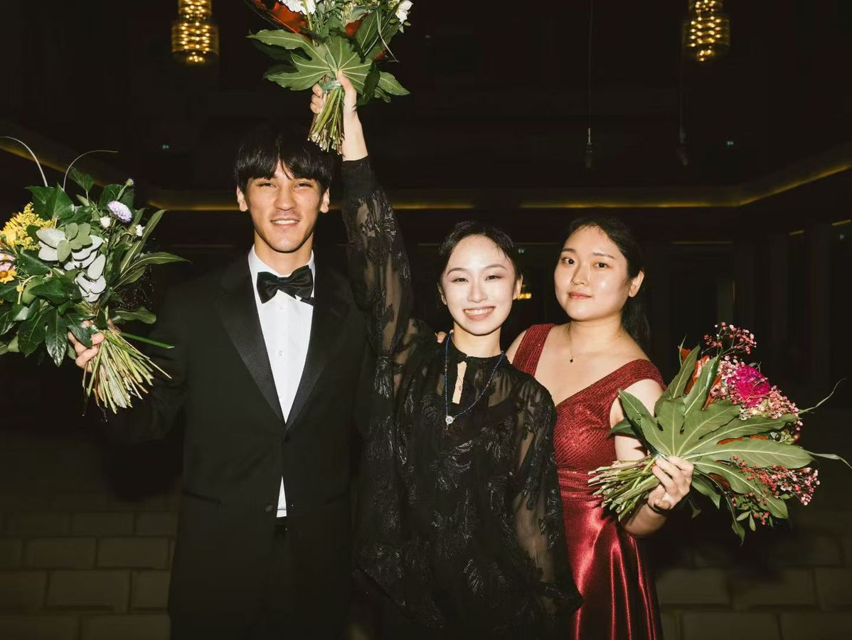 Winners of the piano category of the 74th edition of the ARD International Music Competition pose together: second prize winner, Elias Ackerley (left), first prize winner Wang Liya (middle) and third prize winner Jiwon Yang.[Photo provided to chinadaily.com.cn]