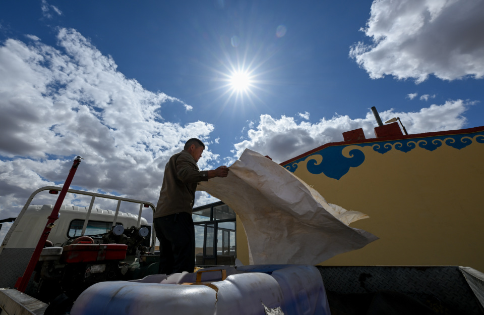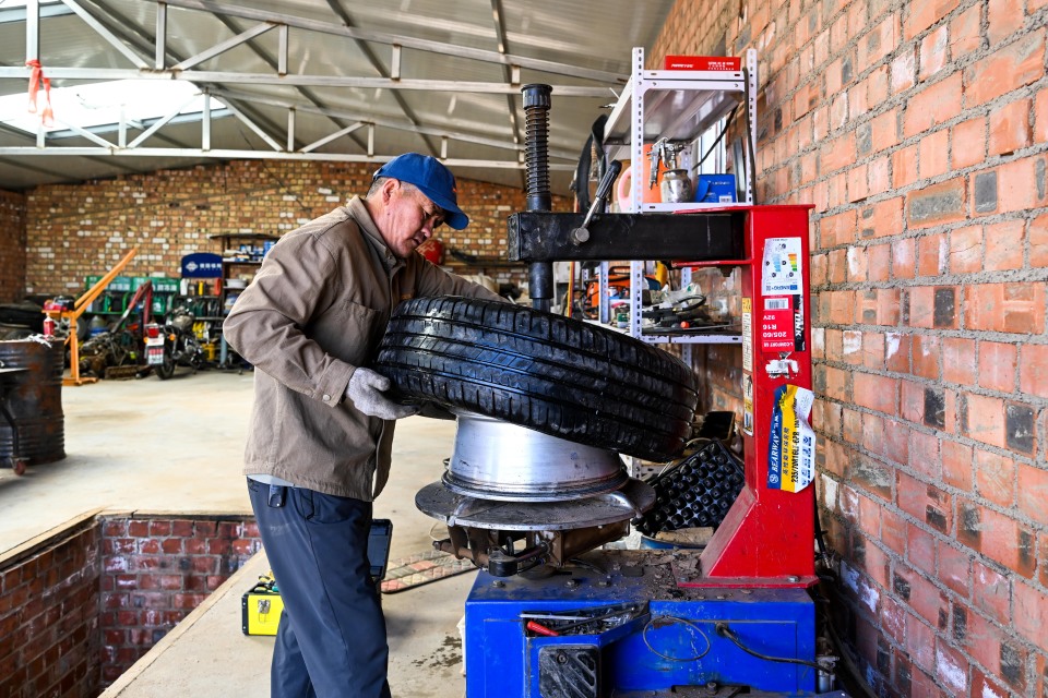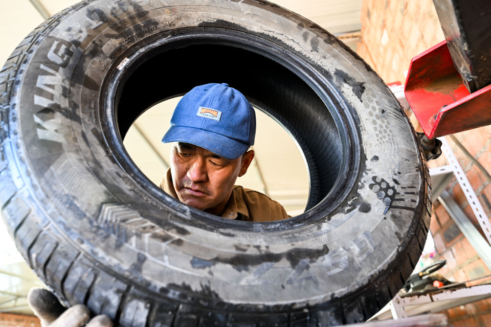 9月23日,钢宝力达在卫境嘎查家中的简易房内安装车胎。新华社记者 李志鹏 摄