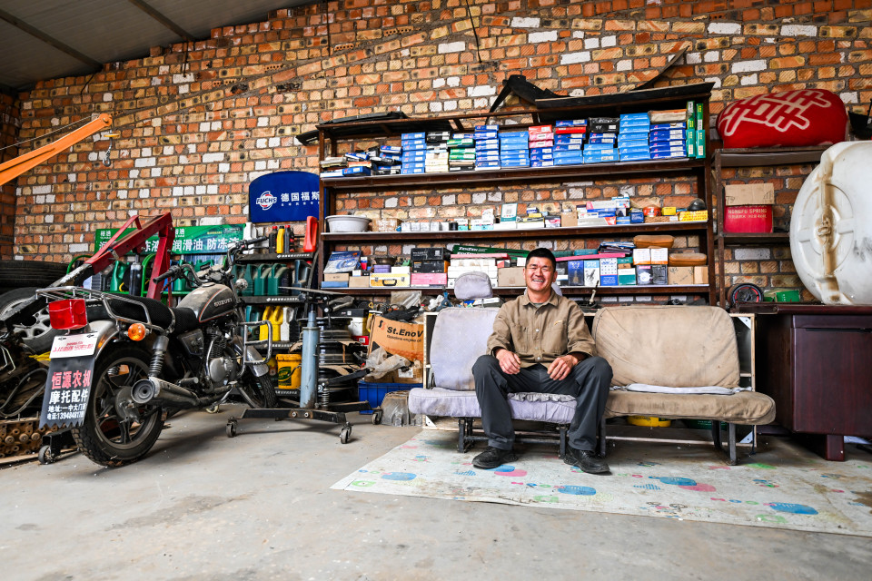 9月23日,钢宝力达坐在卫境嘎查家中的简易房内休息,简易房内摆满了各类修车工具和配件。新华社记者 连振 摄