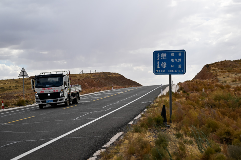 9月23日,钢宝力达驾驶救援车行驶在边境公路上,路边设置有标明他联系电话的指示牌。新华社记者 李志鹏 摄