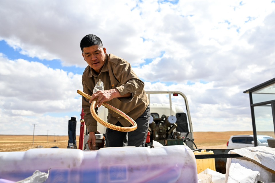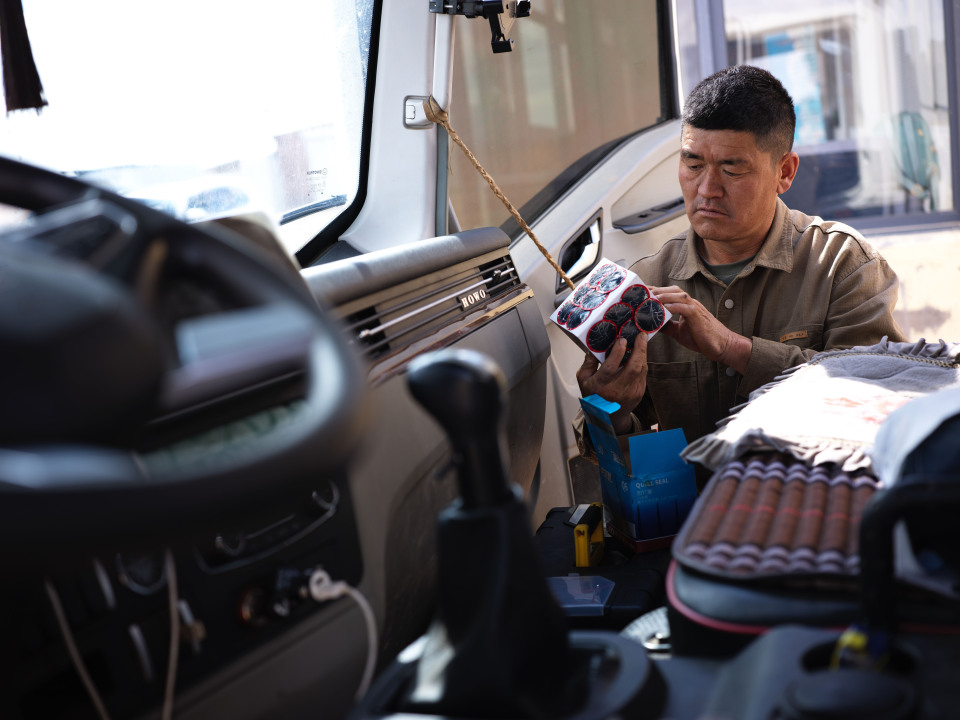 9月23日,钢宝力达仔细检查随车携带的汽车配件。新华社记者 刘金海 摄