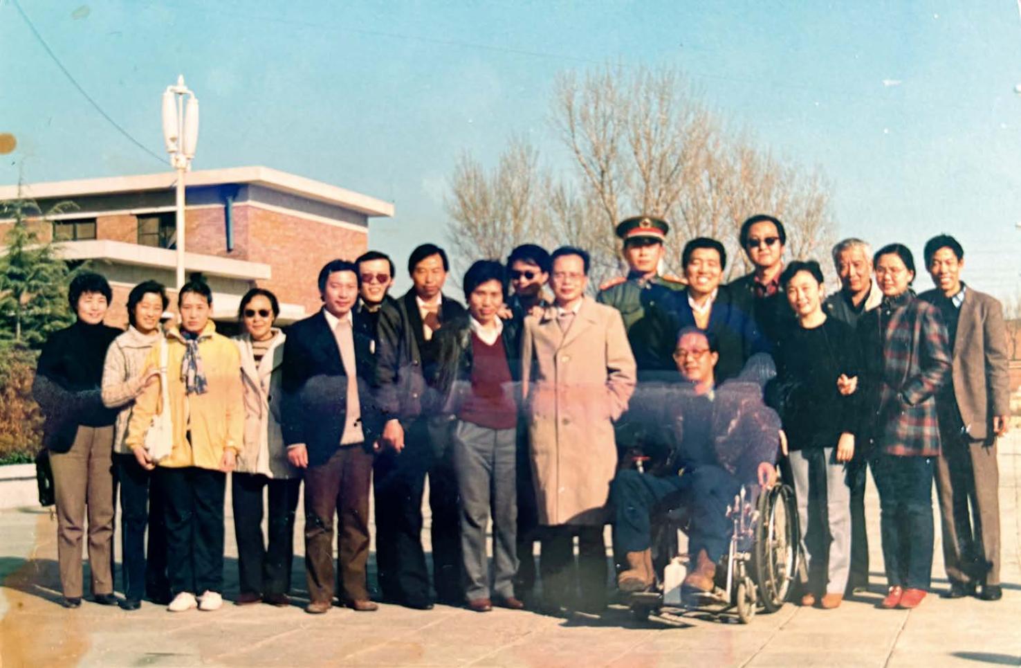 1989年,北京,《三月风》杂志社举办的首届文学奖评选结束后,编辑部与获奖者合影。左三为赵泽华,前排坐轮椅者为史铁生。(受访者供图)