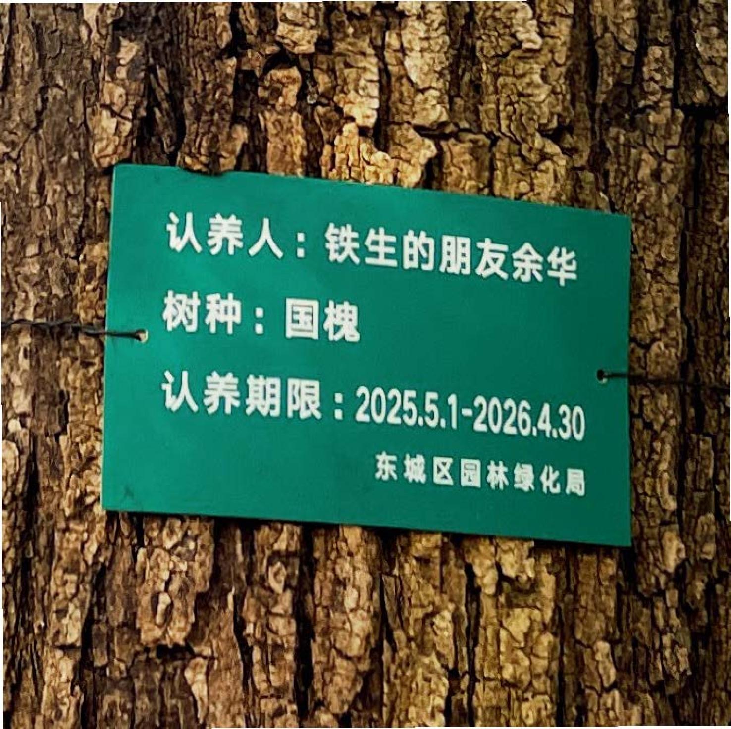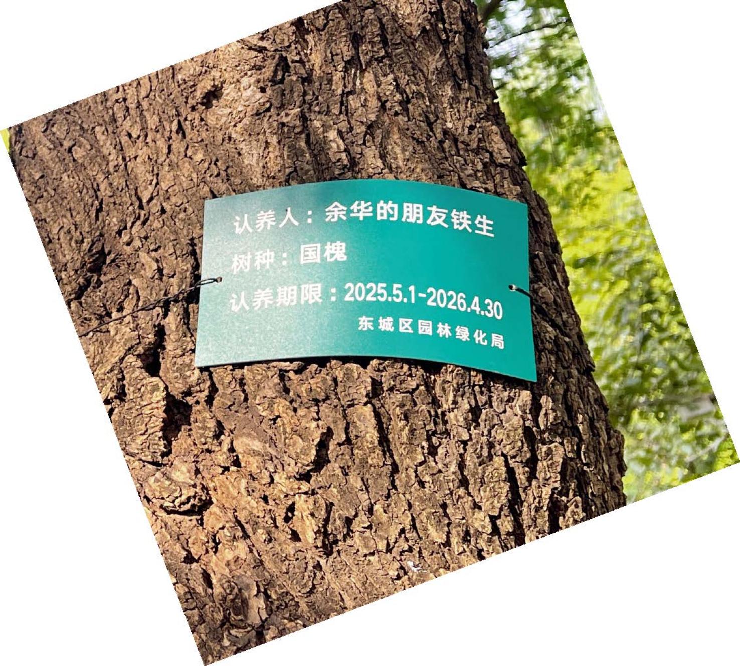 游客认养的两棵国槐树,一棵上面写着“认养人:余华的朋友铁生”,另一棵写着“认养人:铁生的朋友余华”,俨然已成为地坛的新景点。两棵树相距不过丈余,正可谓“根,紧握在地下;叶,相触在云里”。两棵树的走红,源自年轻一代对“伟大友谊”的情感共鸣。
